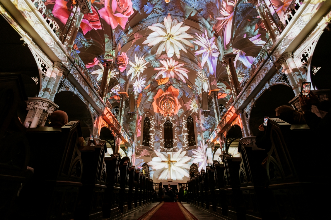 “GENESIS: An Immersive Lightshow” takes guests on a mesmerizing journey inspired by the seven days of the creation of the Universe. The approximately 30 minute experience is divided into thematic chapters that follow the days of the creation story: light, water and air, earth and plant life, celestial bodies, animals of water and air, land animals and humans, and finally the day of rest. Visitors enjoy the show while seated on comfortable bean bags, gazing up at the captivating projections unfolding across the ceiling and walls of the venue
